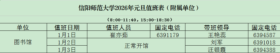 根据学校有关通知精神和图书馆具体工作安排,谭山校区图书馆2026年元旦(1月1日)当天闭馆,其他时间正常开放。闭馆期间,数字文献资源24小时提供不间断服务。开馆及值班情况如下: