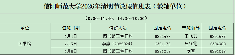 根据学校有关通知精神和图书馆具体工作安排,谭山校区图书馆清明节当天(4月5日)闭馆一天,4月4、6日,正常开放。闭馆期间,数字文献资源24小时提供不间断服务。开馆及值班情况如下: